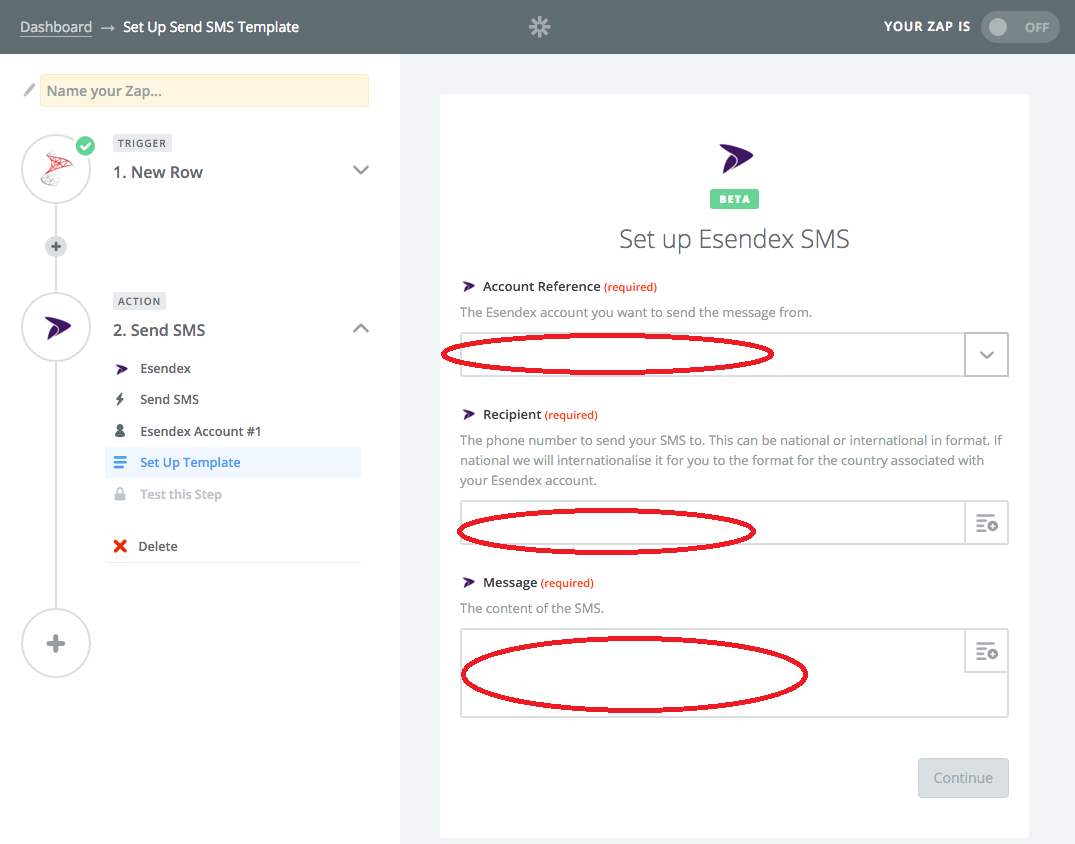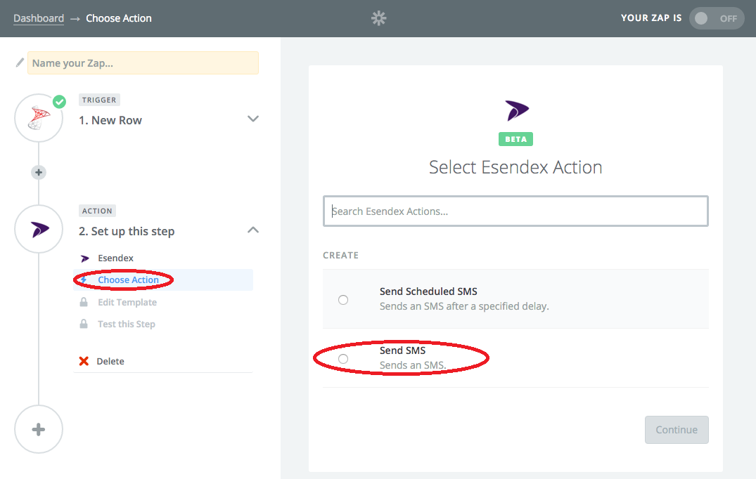 You will then need to tell Zapier the specific action that you want it to perform from your trigger application. You will then need to select the action that you want Esendex to take, which in this case is sending an SMS. Select “Send SMS” and then continue.
