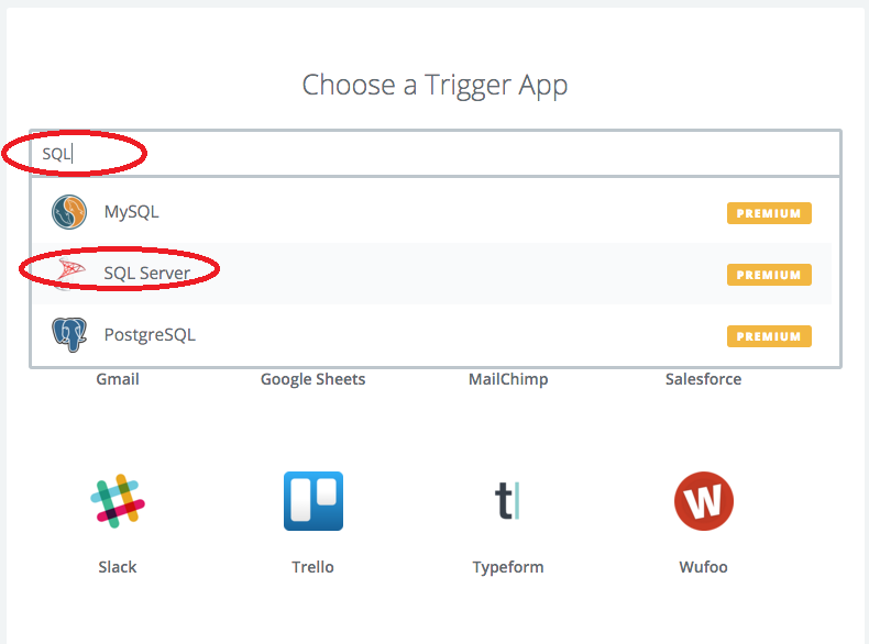 The next step is to define the type of Zap that you are trying to create, in this case it is SQL. Type SQL into the box and select the SQL Server application.