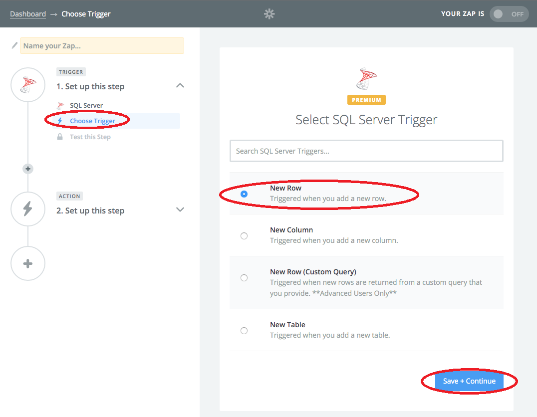 In this case we want an SMS to be sent whenever a “New Row” is added to the SQL document. So for the purposes of this example, select “New Row” and then select save and continue.