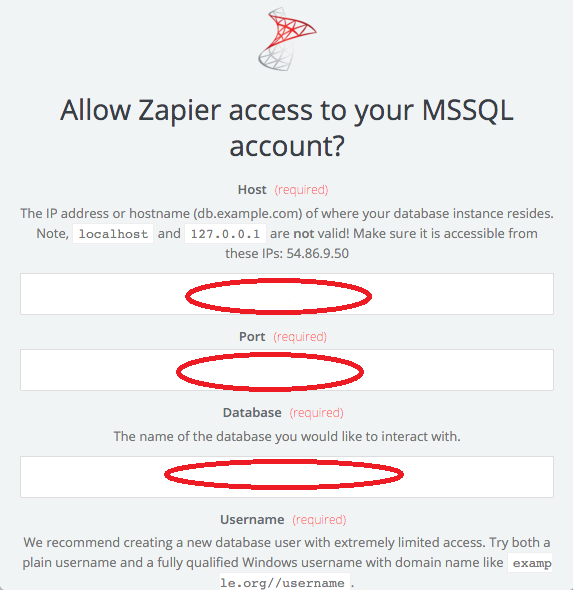 It is important that you enter your information correctly in the boxes exemplified above and double check, that when setting up the SQL login that the SQL server is reachable from the IP that Zapier defines in its instructions.