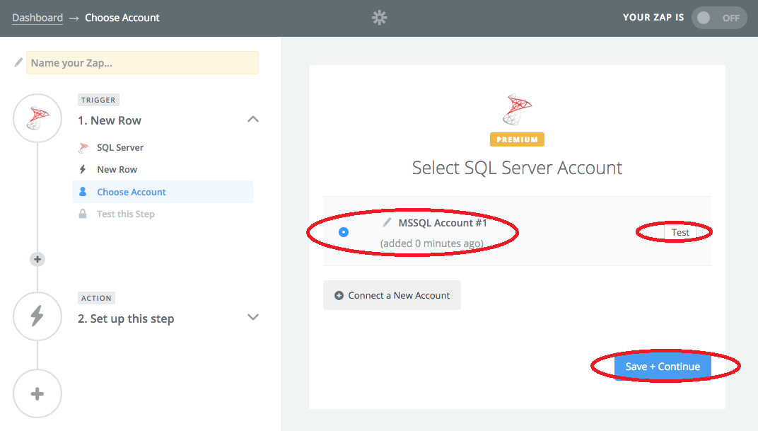 The next step is to connect your SQL Server account with Zapier in order for the trigger actions to be completed.