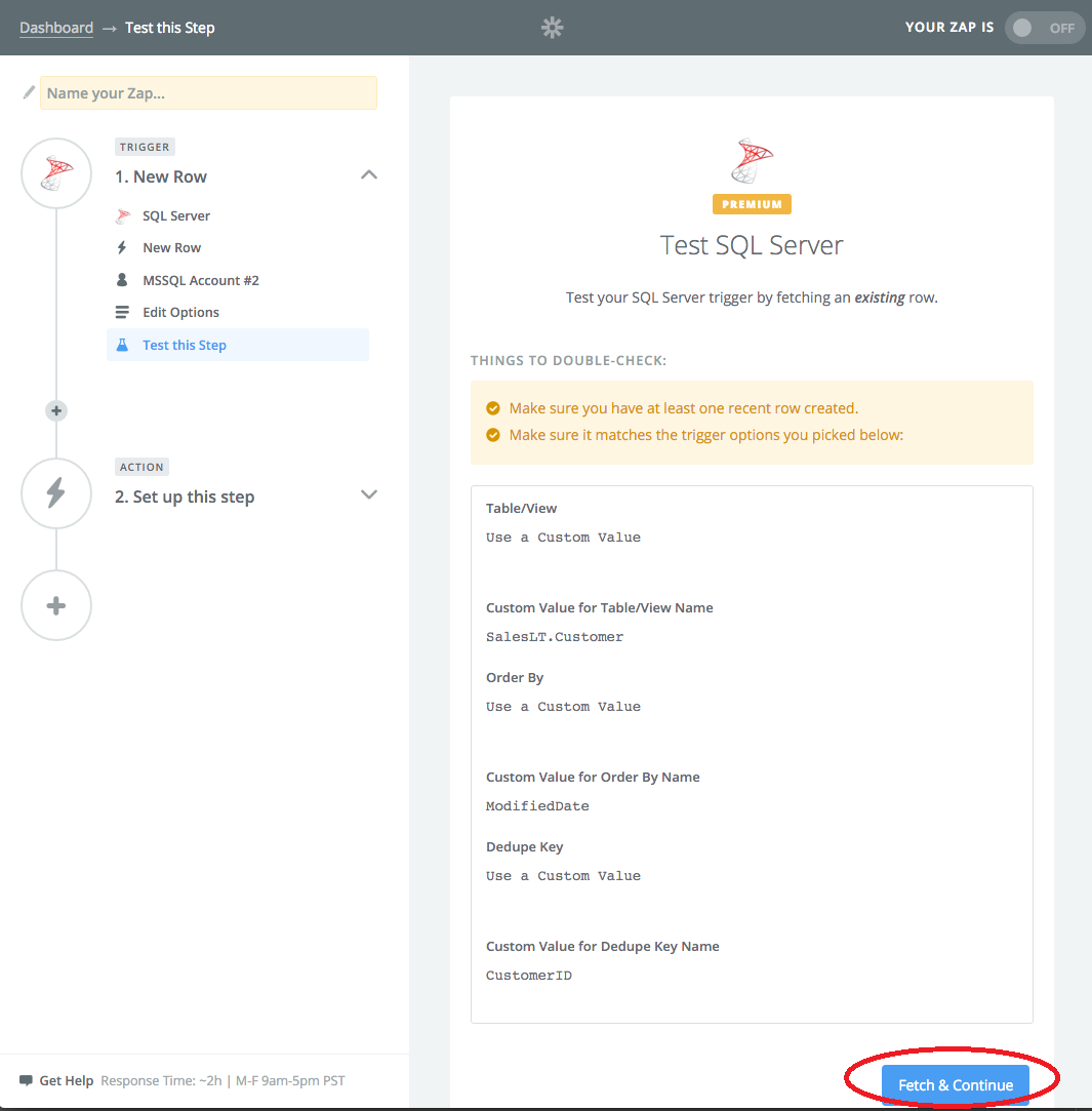 You will then need to test your trigger by fetching an existing row so ensure that there is one available in your SQL account to test with. Check the information then press save and continue.