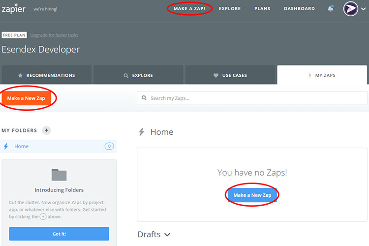 The Zapier welcome interface offers plenty of opportunity to get started with creating your first ‘Zap’. The first step in creating your SQL SMS trigger is to click on any of these.