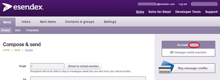Consult your welcome email in order to locate your Esendex account reference. You will have received this upon initial sign up. Aternatively you can log in to echo and view it on the welcome interface detailed below. It will look something like this: EX0000001.
